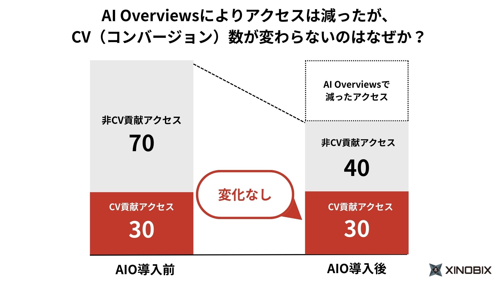 AI Overviews登場後は、CVの可能性が高い30人はこれまで通りサイトを訪れる一方で、CVしない70人のうち30人はAIの回答で満足して離脱する。結果、サイトへのアクセスは70人になりますが、CVする30人は変わらない。これが、今起きていることの実態に近いように感じます。