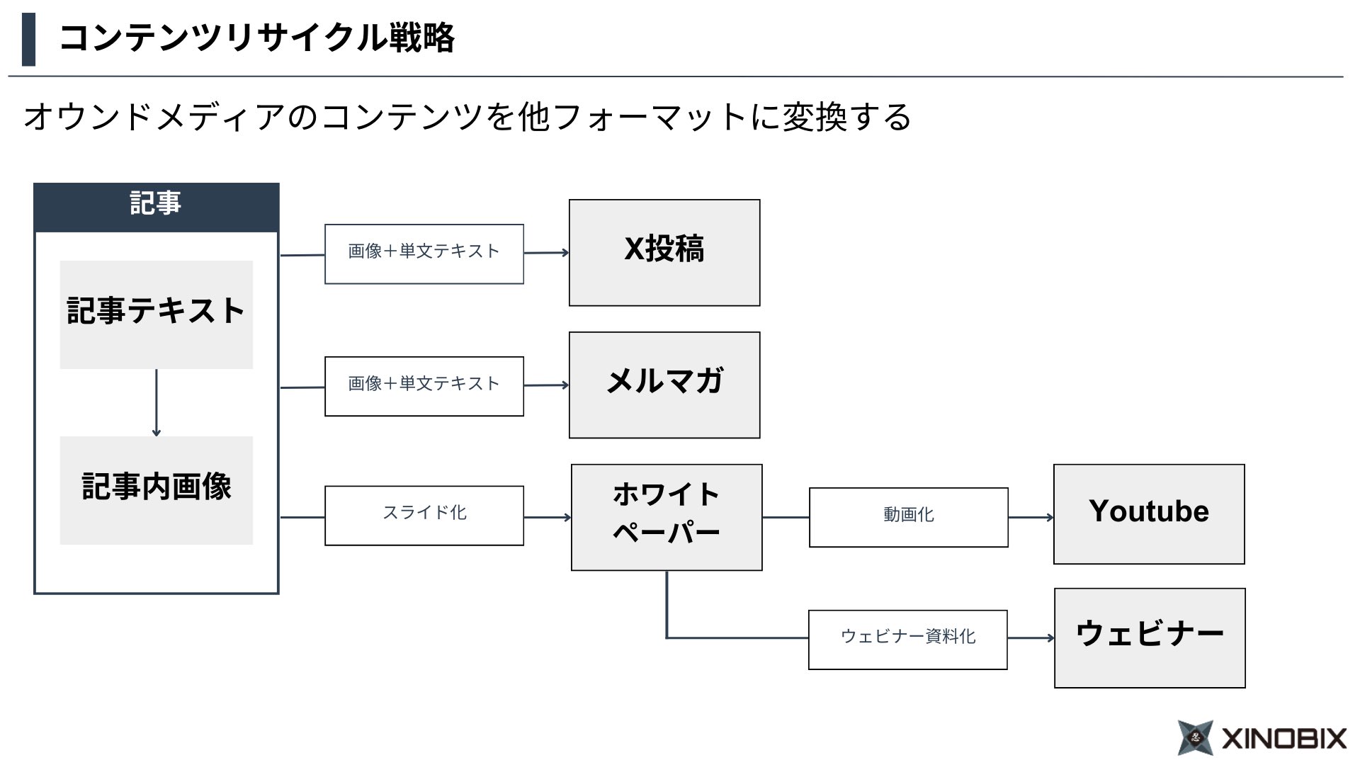 1本の記事に含まれるテキストや画像を元に、Xの投稿やメルマガを作成する。記事内の画像をスライド化してホワイトペーパーにまとめ、さらにそれを動画にしてYouTubeで配信したり、ウェビナーの資料として活用したりする。