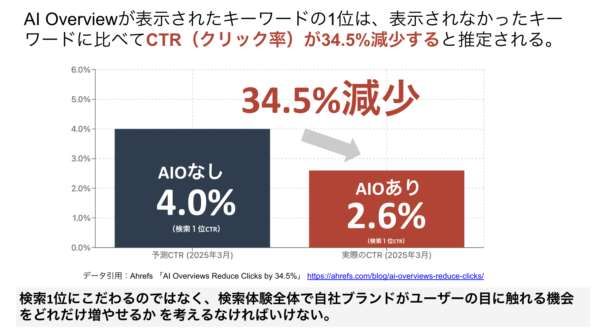 Ahrefsが30万キーワードを分析した調査によると、AI Overviewが表示された検索結果は、表示されていない類似のキーワードと比較して、検索1位のページのCTRが平均34.5%も低いことが判明しました。