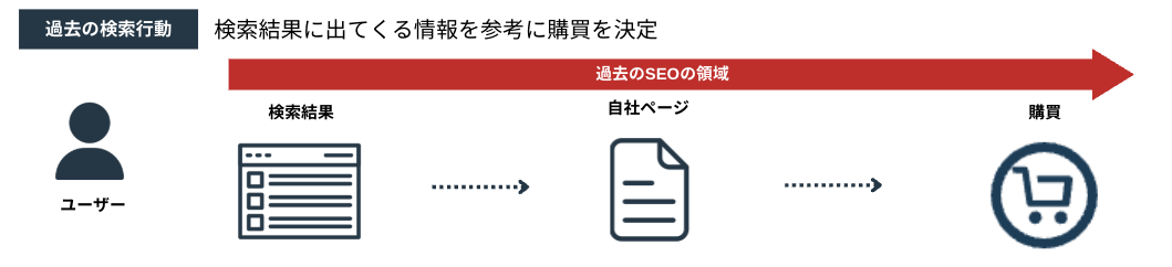 検索エンジンが購買行動に大きな影響を及ぼしていた時代のユーザー行動は、とてもシンプルでした。検索してたどり着き、購買する。この一直線の道のりにおいて、SEOは絶対的な王様でした。