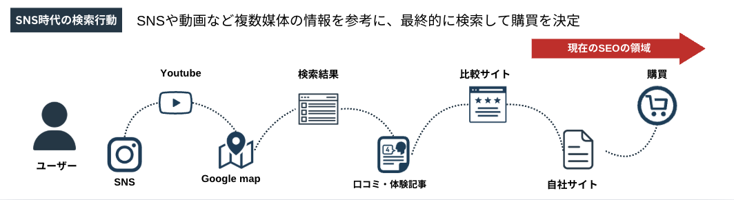 ユーザーはSNSで情報を探し、YouTubeで動画を観て、Googleマップで場所を確かめる。口コミサイトや比較サイトを渡り歩き、さまざまな角度から情報を吟味した上で、最後に「裏付け」を取るかのように検索し、ようやくサイトにたどり着く。