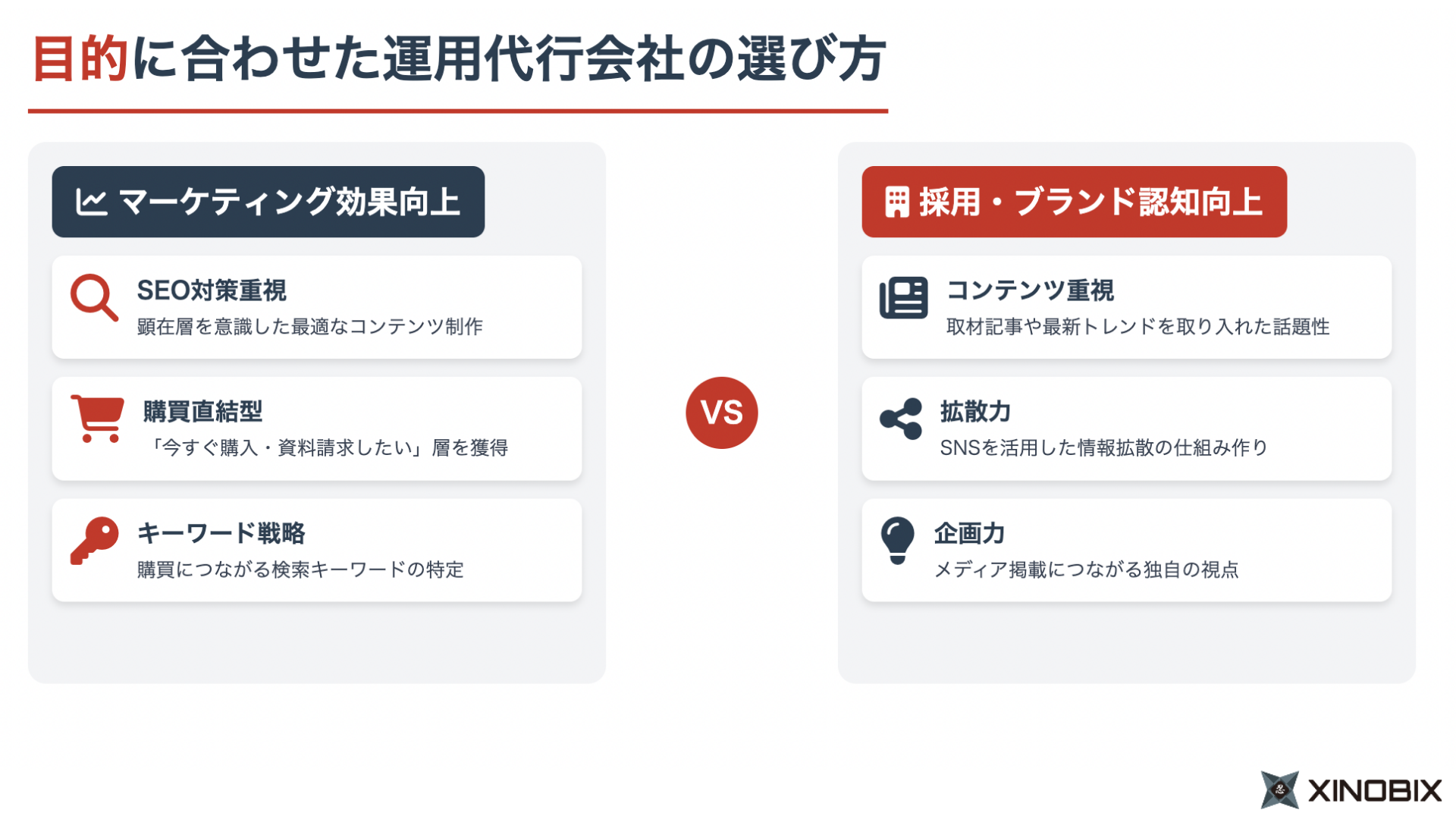 | XINOBIX株式会社 (戦略・制作まで一括支援) | ・累計100社以上のオウンドメディア支援 ・戦略設計から制作まで一括対応 | ・初めてオウンドメディアを立ち上げる企業 ・戦略から制作まで一括で任せたい企業 |